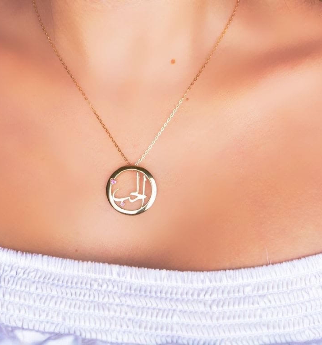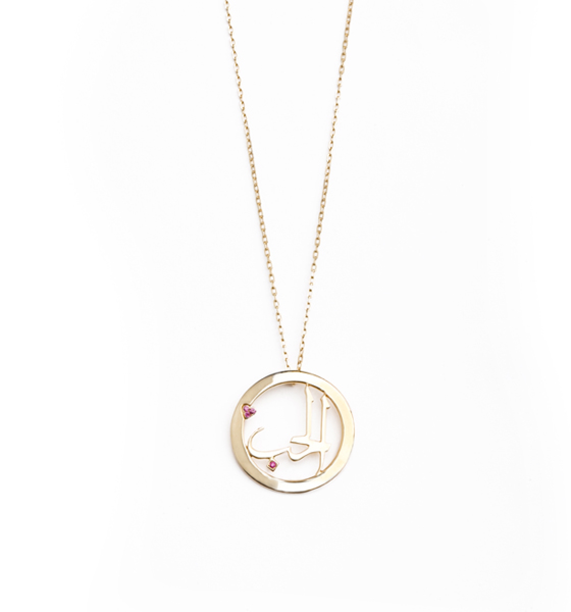 the word "love" in Arabic calligraphy in the center of a circle representing the infinite feeling of love, studded in ruby the stone of passion and love. simply the perfect way to declare your love.